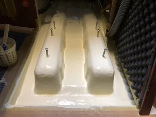 Um den POD-Antrieb möglichst großflächig und robust mit dem Rumpf zu verbinden, habe ich Konterplatten für Batteriefundament, Batterieauflager und Fundament des POD-Antriebs einlaminieren lassen.